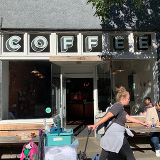 Walked back to get the bus. Election coming up, there're placards everywhere. Secondary business district with some character. Street with bike lanes..